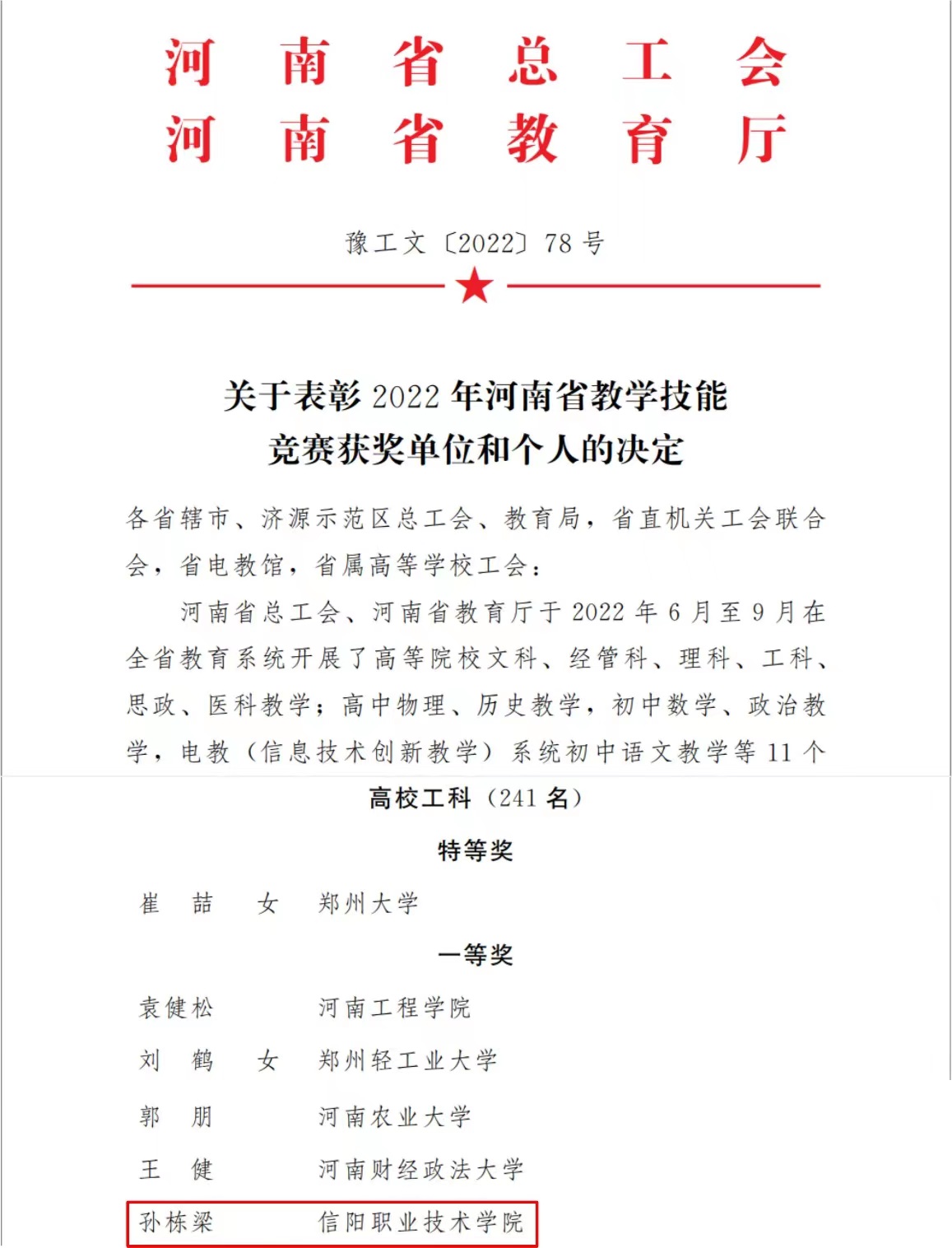 2022年9月16日,由河南省总工会、河南省教育厅主办,河南省教科文卫体工会以及洛阳理工学院承办的河南省教育系统2022年度教学技能竞赛(现场决赛)落下帷幕。信阳职业技术学院j9国际站教师孙栋梁进入决赛,荣获高校工科组一等奖,被授予“河南省优秀教学标兵”荣誉称号。