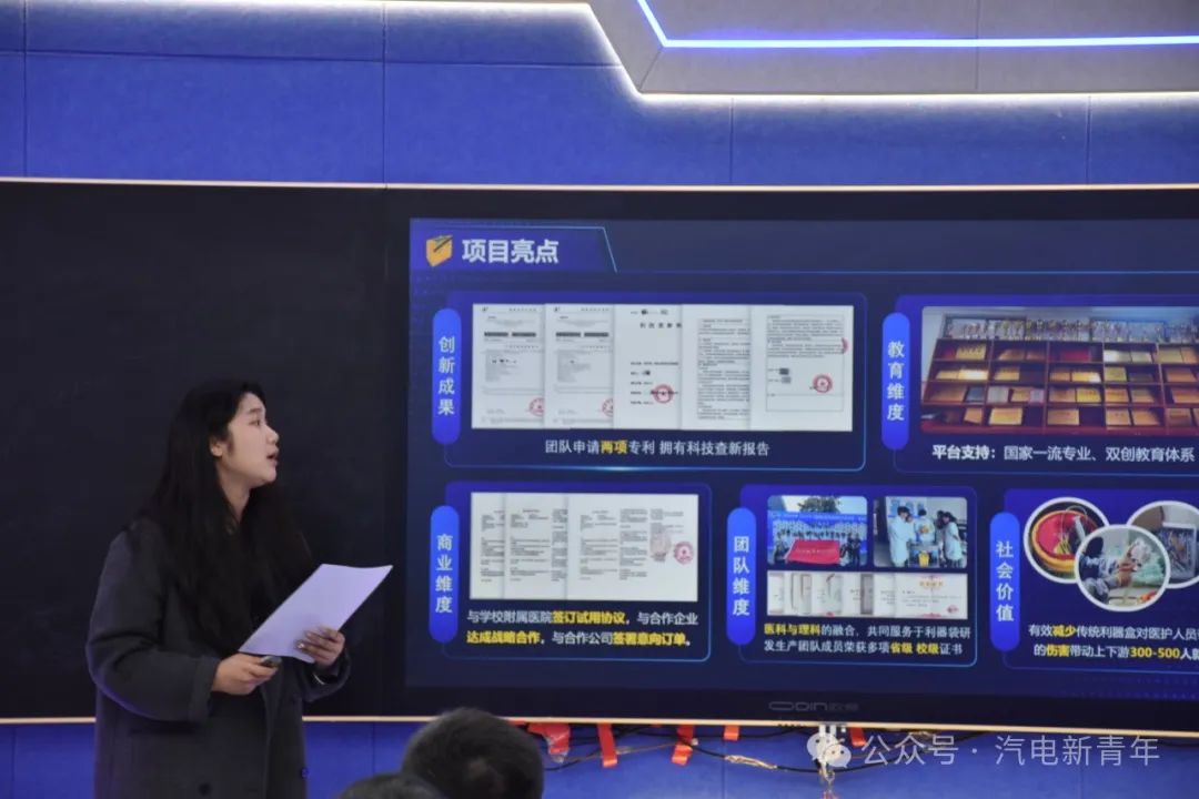 周靖怡对《利可柔”国内首创软体利器袋》项目进行现场路演”。该项目荣获2024年“挑战杯”河南省大学生创业计划竞赛金奖团队负责人分享道:“项目灵感源于对生活问题的观察,”该案例生动诠释了“从生活中发现需求,以跨学科协作实现成果转化”的理念。